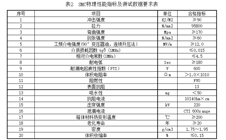 2.3.1分支箱外殼選用S304不銹鋼資料,箱體、門體資料厚度均不該小于2毫米,或SMC復合資料箱體,SMC物理功能指標及測試數據滿意表2的要求。