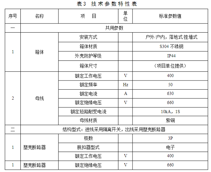 2.3.11在使用中可以互換的具有同樣額定值和結構的組件,應具有互換性。?3?規范技術參數?技術參數特性表是對收購設備的基礎技術參數要求,供貨方應對技術參數特性表中規范參數值進行呼應。低壓電纜分支箱技術參數特性見表3