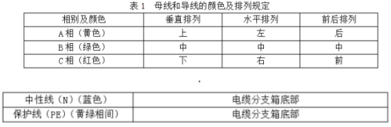 1)選用選用矩形母線,質料為T2電工銅。并選用不同相色熱縮套管做絕緣處理。熱縮套管不得開裂和起皺,母線接頭處用熱縮絕緣盒封閉。絕緣熱縮護套資料應具有阻燃、防腐、抗老化的要求,老化壽數不小于30年,具體實驗方法和要求參照GB/T2951.14中規矩實施。(2)銅排截面的挑選應保證可以耐受IEC60298中引薦的額定短時耐受和峰值耐受電流的要求,N相(L0)母線與三相母線標準相同,PE排截面不低于相排截面的1/2。其間設于野外的低壓電纜分支箱裝備4根母排(3L+PEN),設于戶內的低壓電纜分支箱裝備5根母排(3L+N+PE)。(3)設備中母線和導線的顏色及擺放應契合GB/T4026GB7947及表1的規矩;