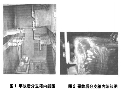 2007年7月18日某地輸配電線路產(chǎn)生跳閘,在巡線至石板坡電纜分支箱時(shí),發(fā)現(xiàn)電纜分支箱兩端的開(kāi)關(guān)柜俑壁產(chǎn)生嚴(yán)峻變形、601進(jìn)線開(kāi)關(guān)柜面板有飛弧、放電及炭黑等現(xiàn)象。外觀上,箱體內(nèi)水跡明顯。外表柜門(mén)已銹死,不得不撬開(kāi),操作組織已無(wú)法翻滾、只能將其潰散后翻開(kāi)關(guān)柜門(mén)。翻開(kāi)#601開(kāi)關(guān)柜電纜室發(fā)現(xiàn):計(jì)量TⅣV的熔斷器及支撐絕緣子兩相全部炸碎、另一相熔斷器產(chǎn)生割裂,支撐絕緣子產(chǎn)生破損,AT外表有爬電痕跡,柜體多處存在放電痕跡,如圖1所示。翻開(kāi)相鄰間隔檢查,狀況相同嚴(yán)峻,導(dǎo)電部分受潮嚴(yán)峻,銅排及固定鏢栓已長(zhǎng)鹵銹,柜體外表有多處爬電痕跡,見(jiàn)圖2。該分支箱為某電器廠制作,2003年投運(yùn)、僅3年多。