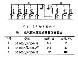 變電站位于高原地區(qū),海拔2100m。變電站選用某公司出產(chǎn)的35kV中壓充氣柜。主接線如圖1所示,其間電壓互感器型號(hào)為JDZx-35(ABC),具體參數(shù)如表1