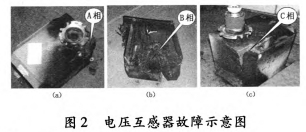 20113300:38,35kV垣潔線、35kV垣宏回AB相電壓互感器擊穿,如圖5所示;201232619:7:58,35kV垣潔線56號(hào)線路電壓互感器ABC相損壞,AB相有迸裂現(xiàn)象。