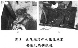查看35kV垣潔線56號(hào)線路電壓互感器上端柜頂,發(fā)現(xiàn)柜頂插拔處燒損,斷路器室壓力開(kāi)釋設(shè)備動(dòng)作。將壓力開(kāi)釋通道翻開(kāi)后,發(fā)現(xiàn)本柜斷路器室壓力開(kāi)釋盤動(dòng)作,壓力開(kāi)釋通道有許多燃弧噴出的落塵。翻開(kāi)斷路器室入孔后,發(fā)現(xiàn)氣室內(nèi)有燃弧痕跡。氣室內(nèi)其它絕緣件未受損,銅排和充氣柜柜體外表有落塵無(wú)燒傷痕跡,如圖3所示。